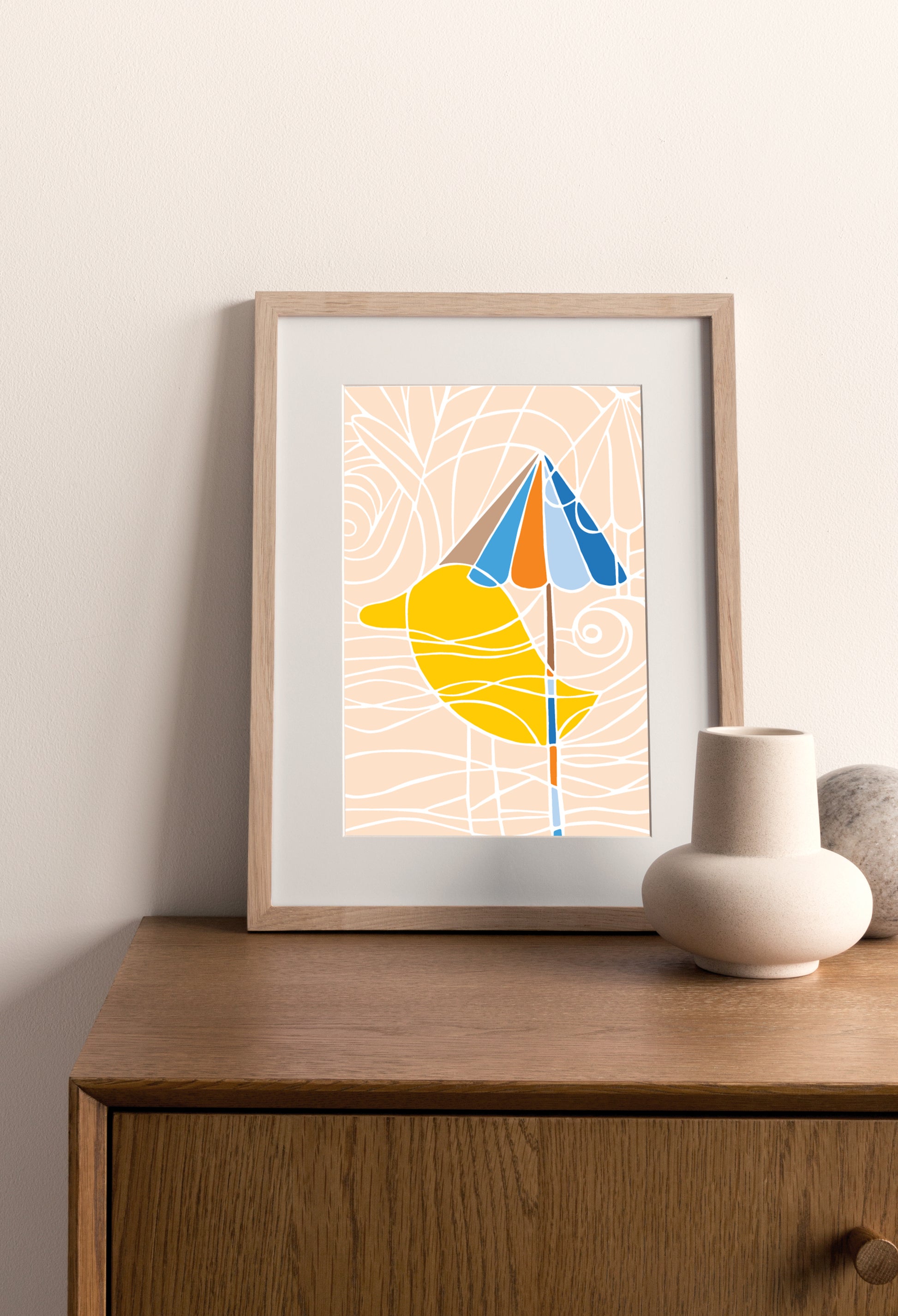 This illustration card captures the joyful calm of a summer day in Greece, featuring the duck and sun umbrellas.