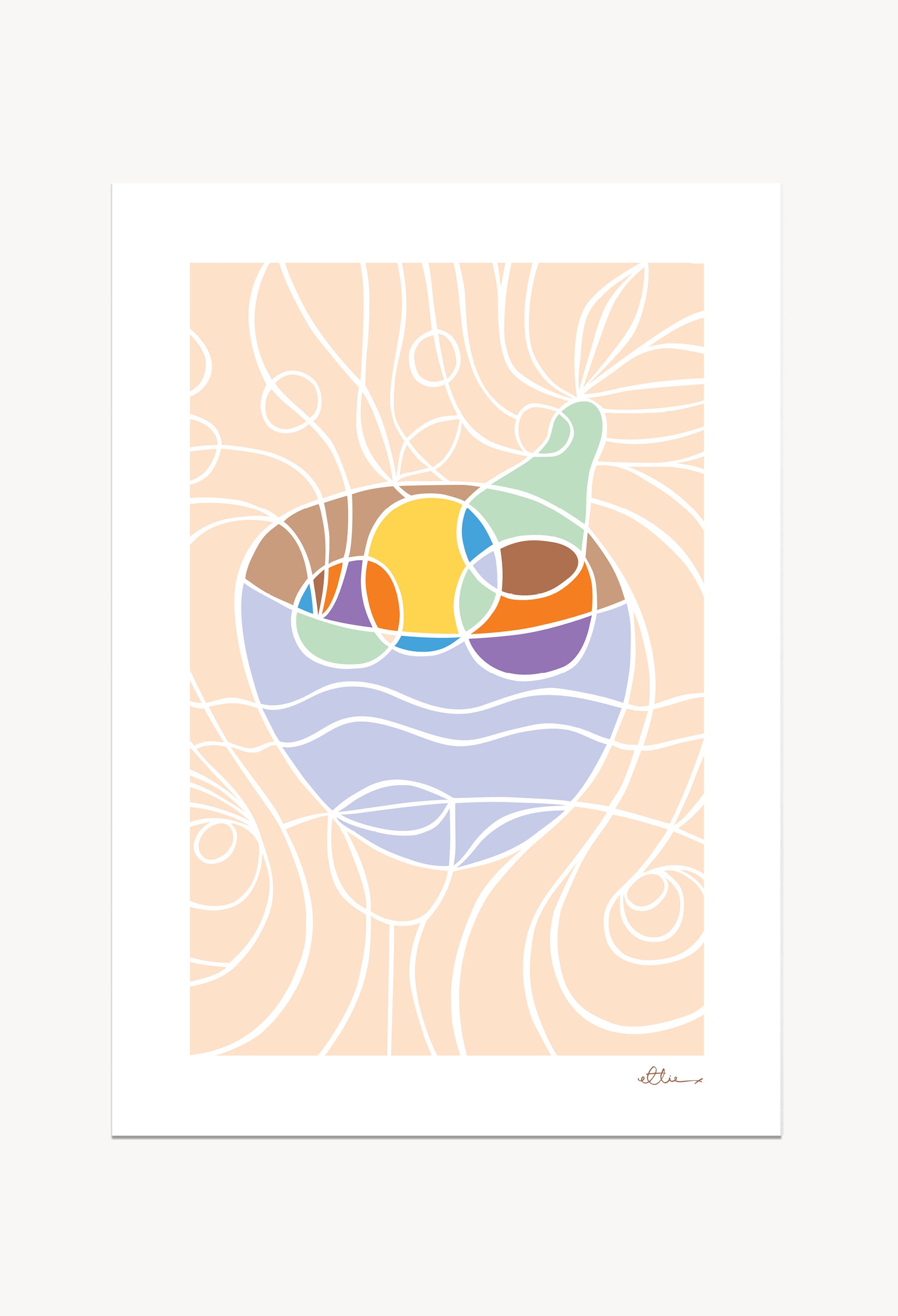 This art print features a bowl of colourful fruit surrounded by swirling lines, all flowing seamlessly together—perfect for adding a fresh, modern touch to your home decor.