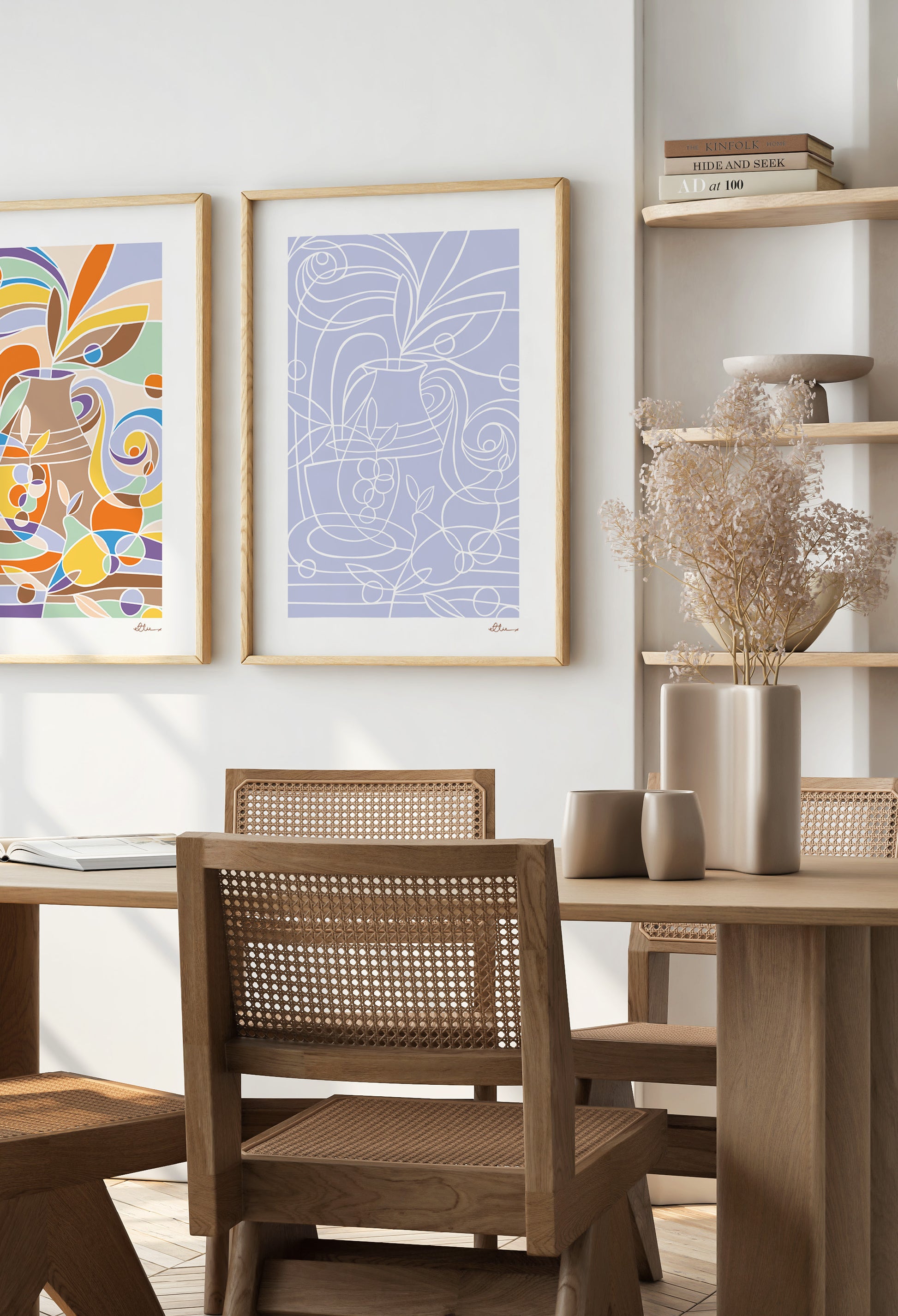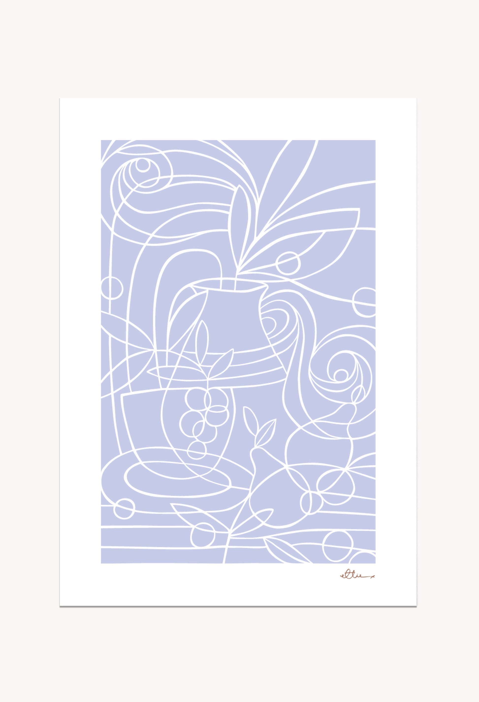This art print features ceramic vessels alongside pears, grapes and olive tree branch, set against a soft lilac background. The composition blends natural shapes and muted colour for a calm still life.