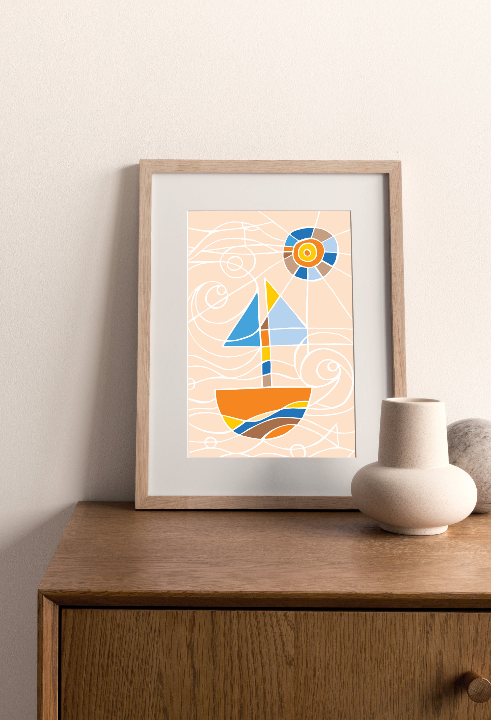 A playful greeting card inspired by seaside holidays in Greece — featuring the sun, sea and boat in joyful summer tones.
