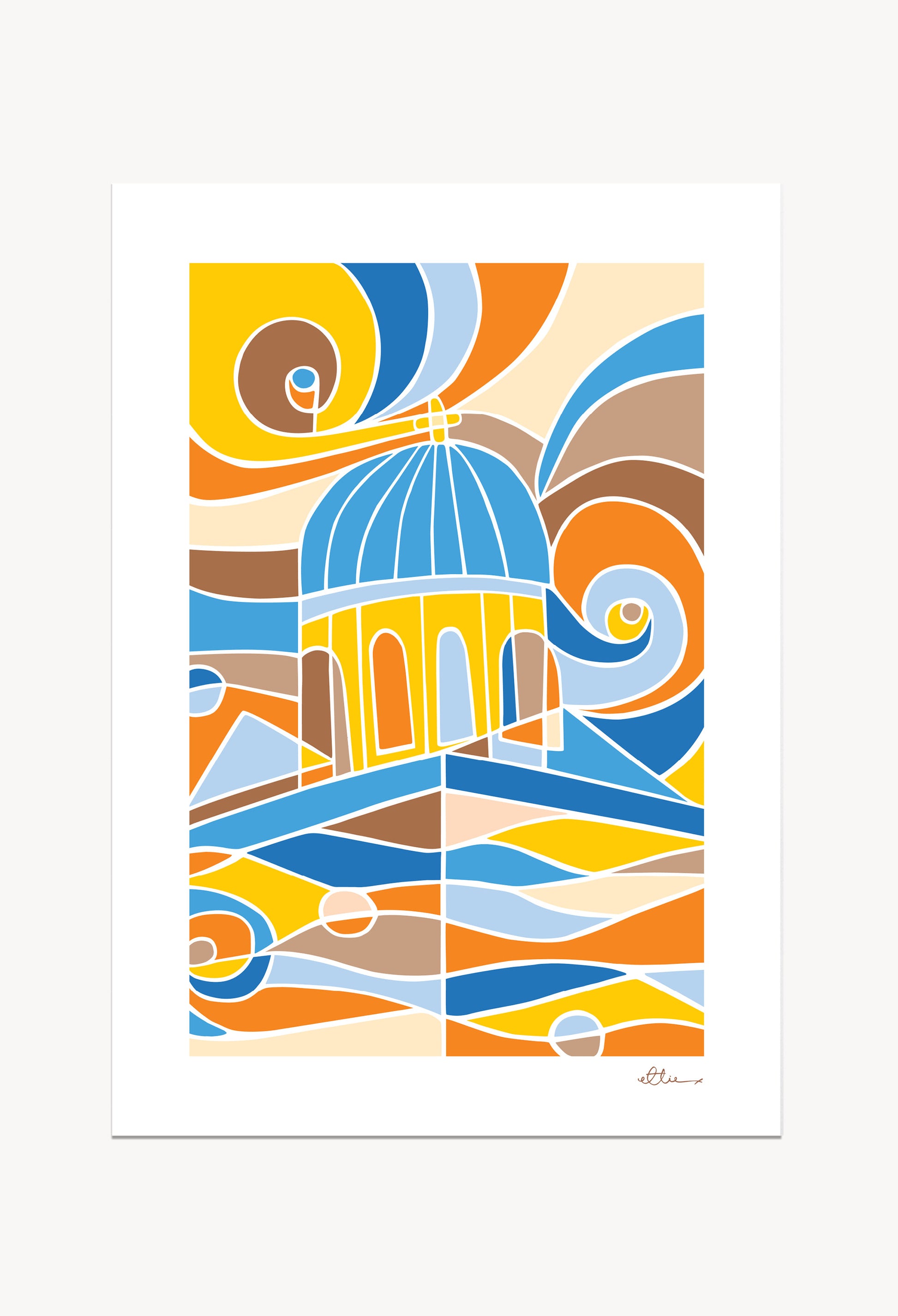 A vibrant illustration in warm oranges, yellows and browns, balanced by the blues, depicting a seaside church inspired by the iconic Saint Nicholas Church on Syros, Greece—designed to evoke the essence of a European summer holiday.