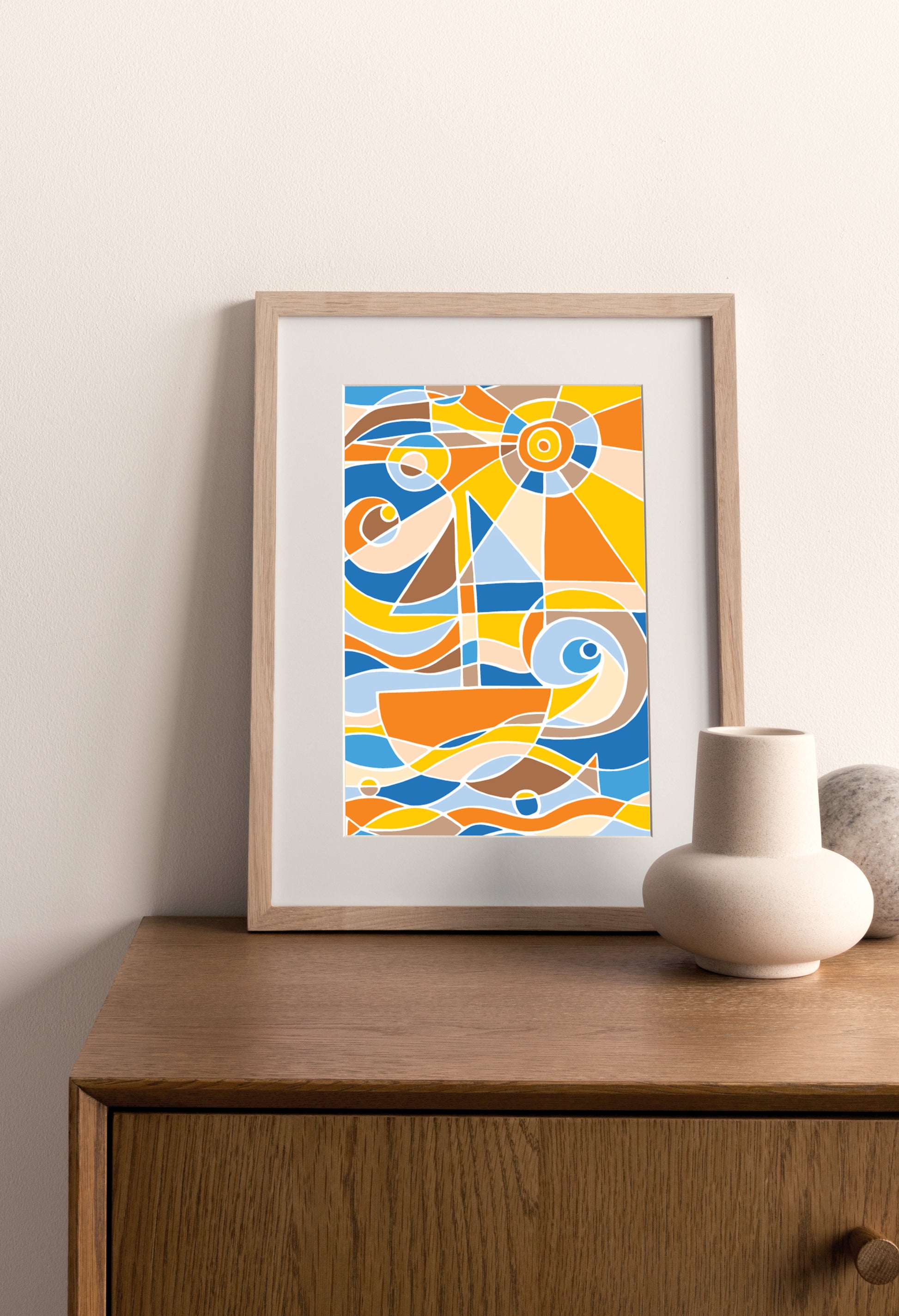 A cheerful seaside art greeting card inspired by European summers — with a boat, fish and sun in warm tones balanced by cool blues.