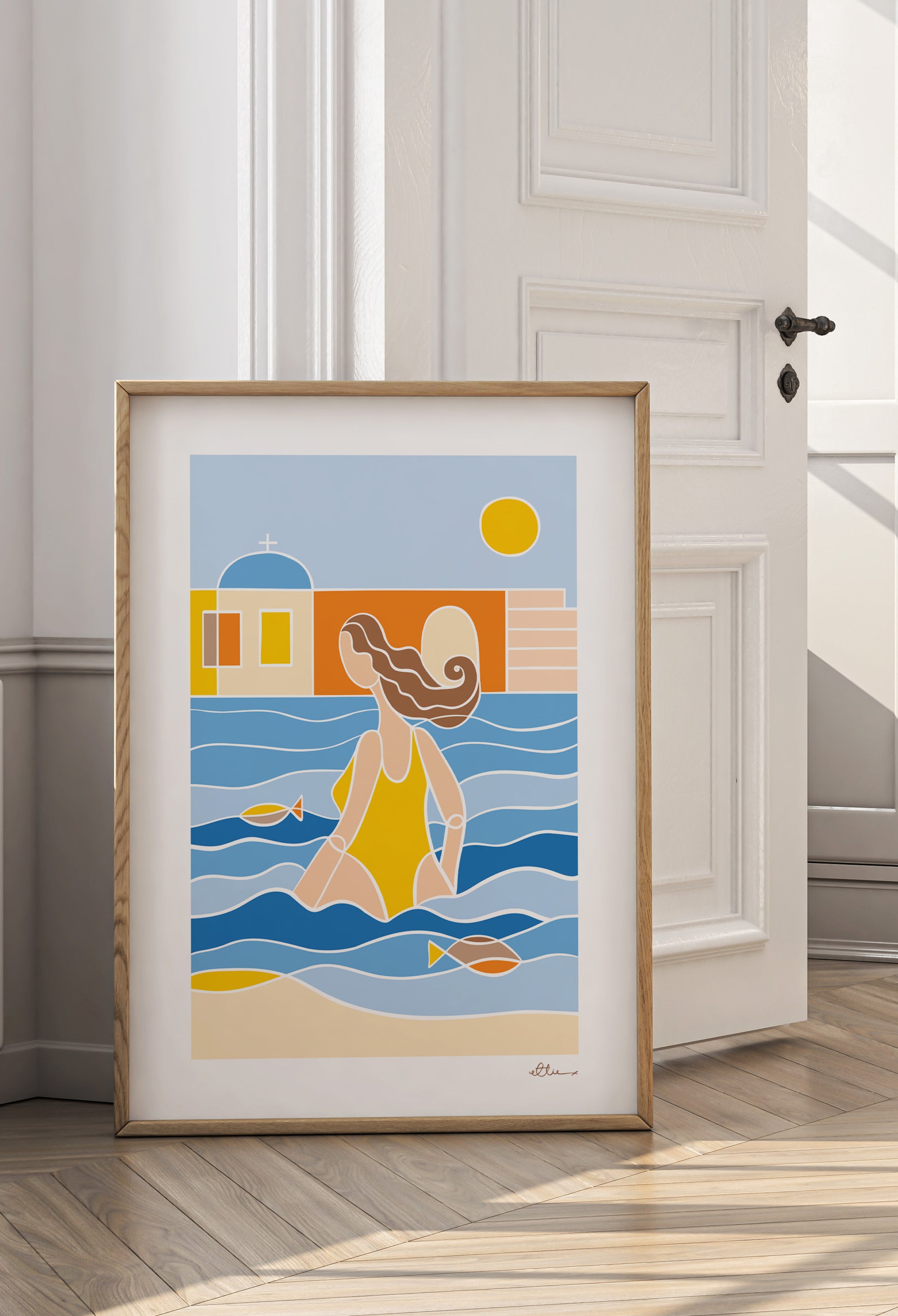 A carefree moment captured in time — a lady steps into the clear blue waters, with a Greek island backdrop behind her.
